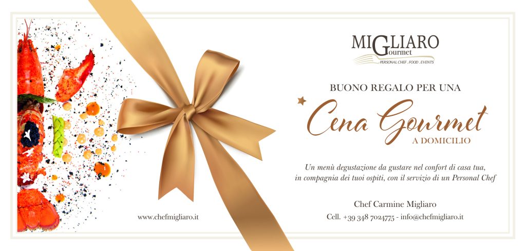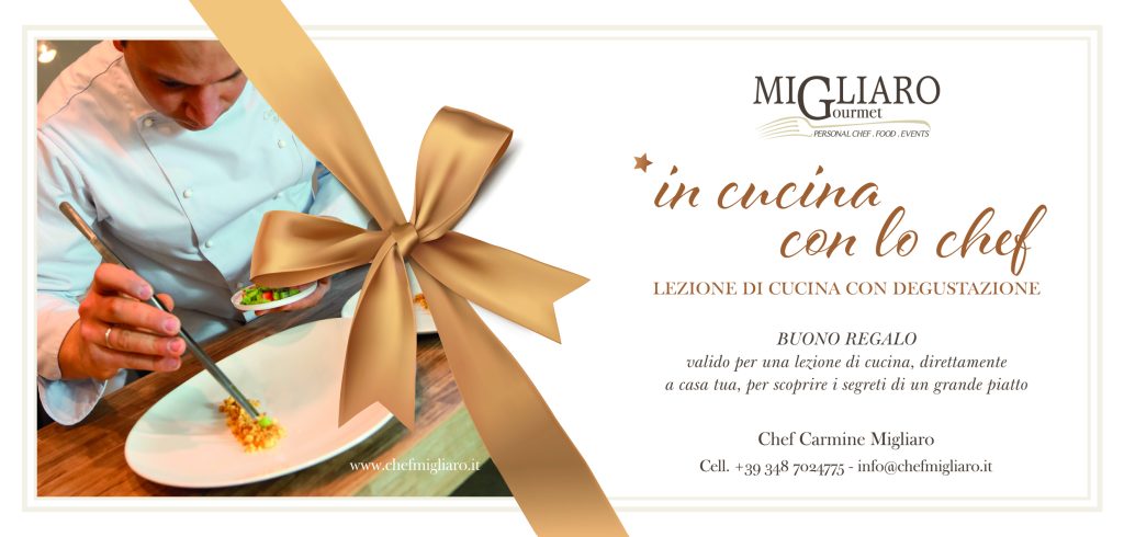 Con le gift cards di Chef Migliaro, puoi regalare un’esperienza culinaria esclusiva con cena a domicilio o una lezione di cucina personalizzata.